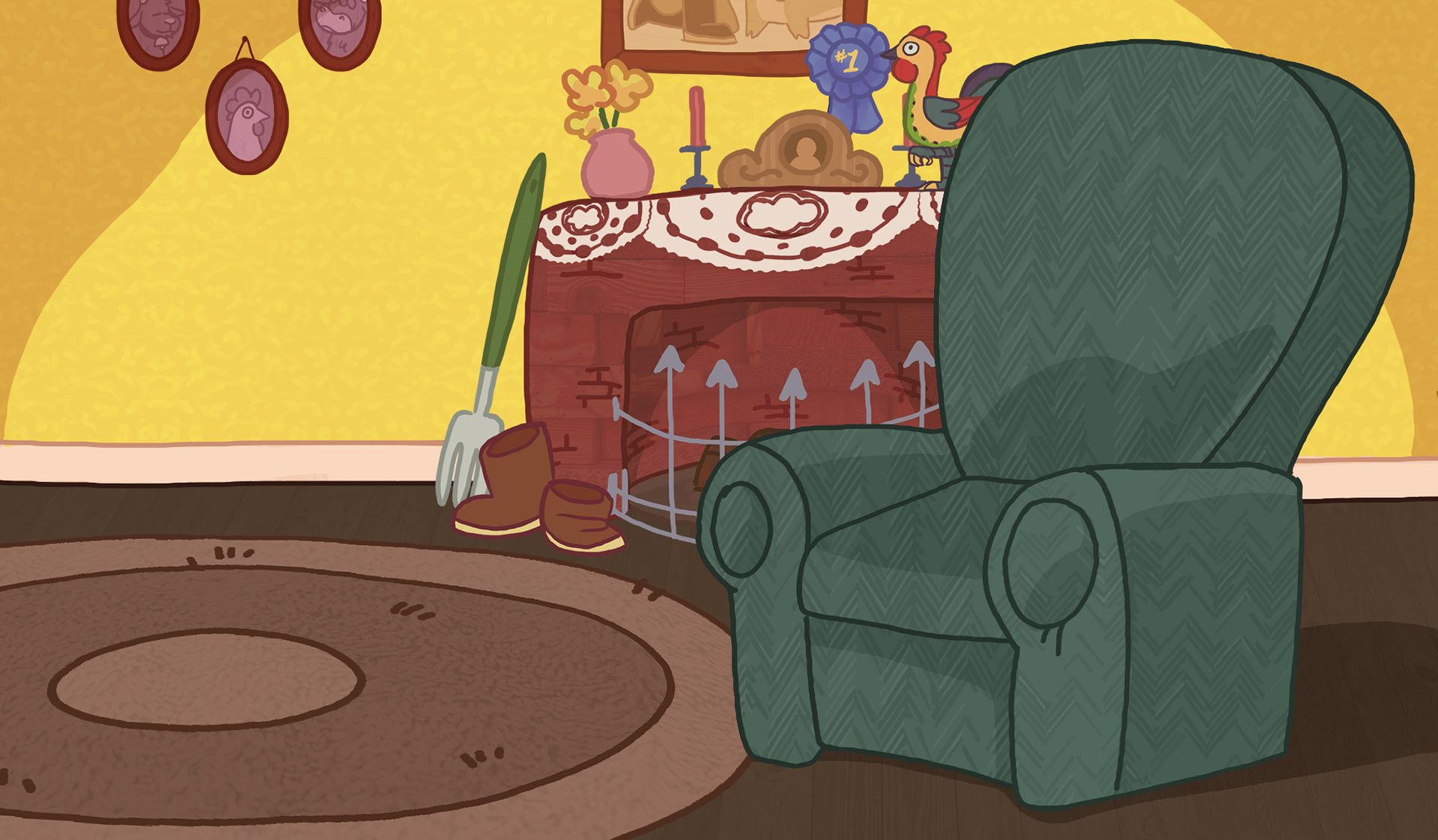 I wanted a clear visual difference and feeling between each location: farmhouse is warm, cozy, and inviting. Farm land is bright and expansive. The meat packing house is threatening, stark, and as red as its weenies.